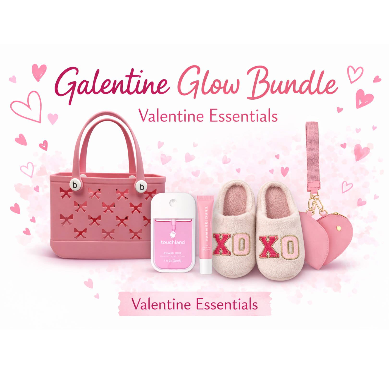 All the Valentine essentials in one feel-good bundle — cute, cozy, and ready to go. This set includes our Bow Bogg® Bag with an allover bow cutout design, a Valentine wristlet to keep your phone, cards, and essentials close (hands-free!), Touchland hand sanitizer, Summer Fridays lip gloss, and soft XOXO slippers for ultimate cozy vibes.
